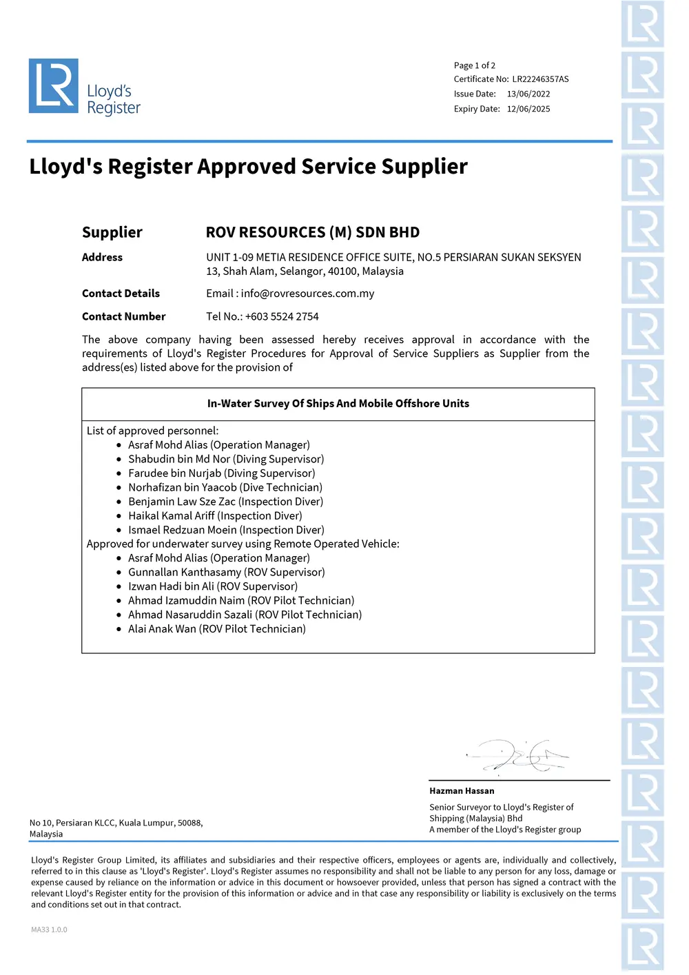 Home»Our Certificates Our Certificates PETRONAS View Certificate MINISTRY OF FINANCE View Certificate INTERNATIONAL MARINE CONTRACTORS ASSOCIATION (IMCA) View Certificate AMERICAN BUREAU OF SHIPPING (ABS) View Certificate BUREAU VERITAS (BV) View Certificate DET NORSKE VERITAS (DNVGL) View Certificate CONSTRUCTION INDUSTRY DEVELOPMENT BOARD (CIDB) View Certificate LLOYD'S REGISTER View Certificate OCCUPATIONAL HEALTH & SAFETY ASSESSMENT SERIES (OHSAS) View Certificate INTERNATIONAL ORGANIZATION FOR STANDARDIZATION (ISO) View Certificate