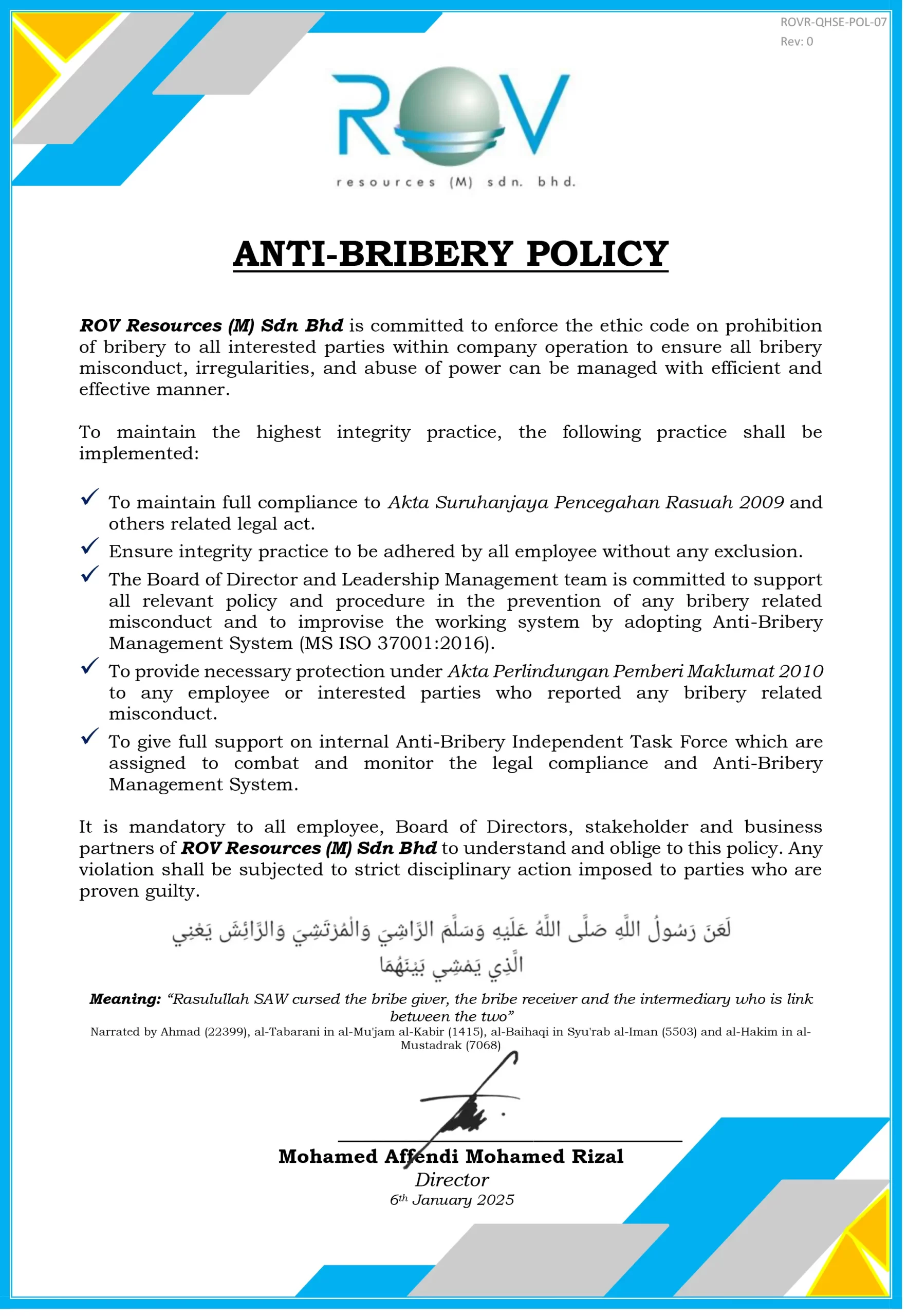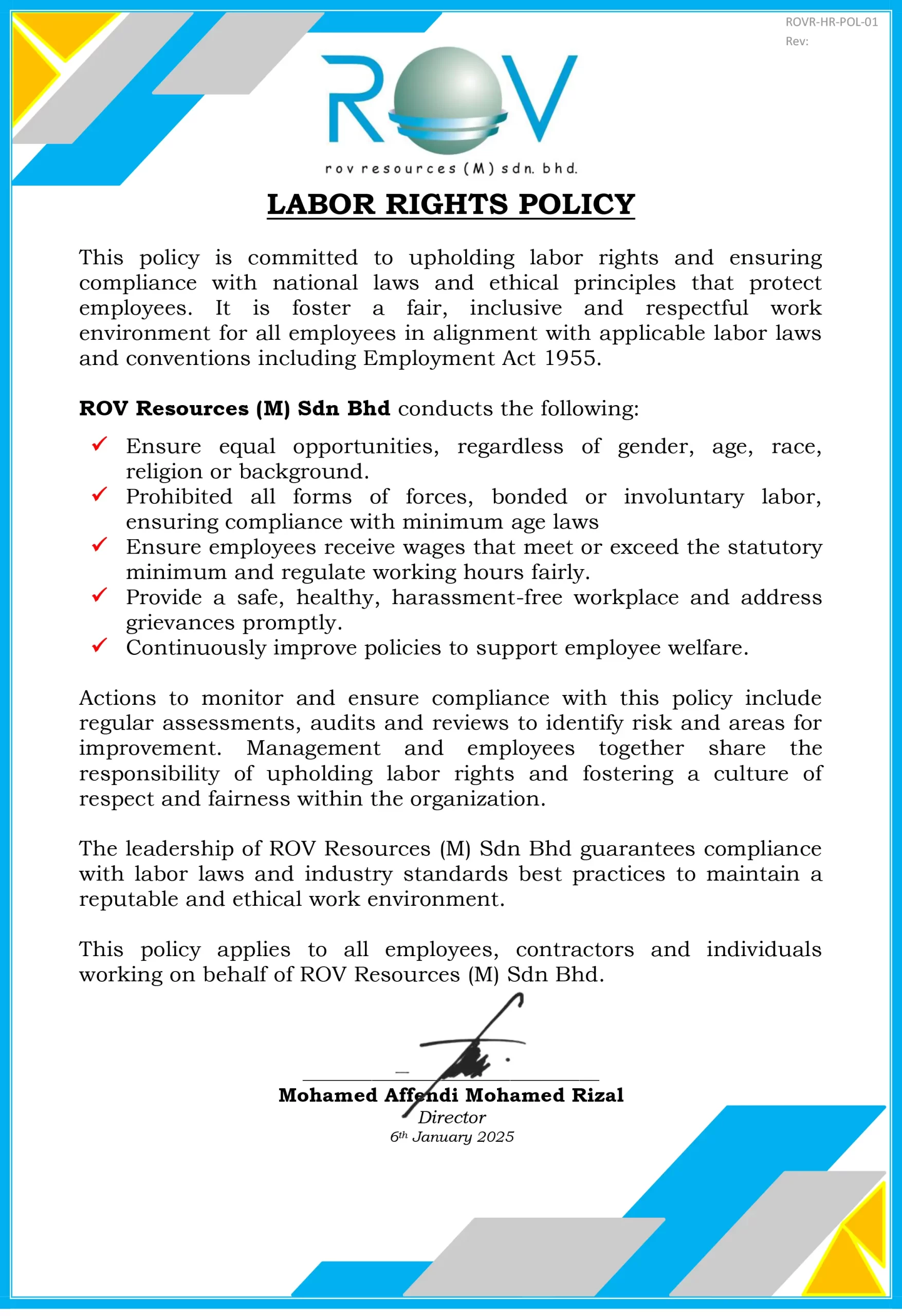 THE COMPANY views HSE as a critical and top priority to our success and long-term sustainability, and as such, we are committed in continuously improving our HSE performance. We undertake to maintain a high standard of Occupational Code of Health integrated with strict discipline on safety and environment in the workplace. ROVR will work closely with employees, clients and business partners to implement a comprehensive HSE program by implementing a structured approach based on the following 5 elements:
